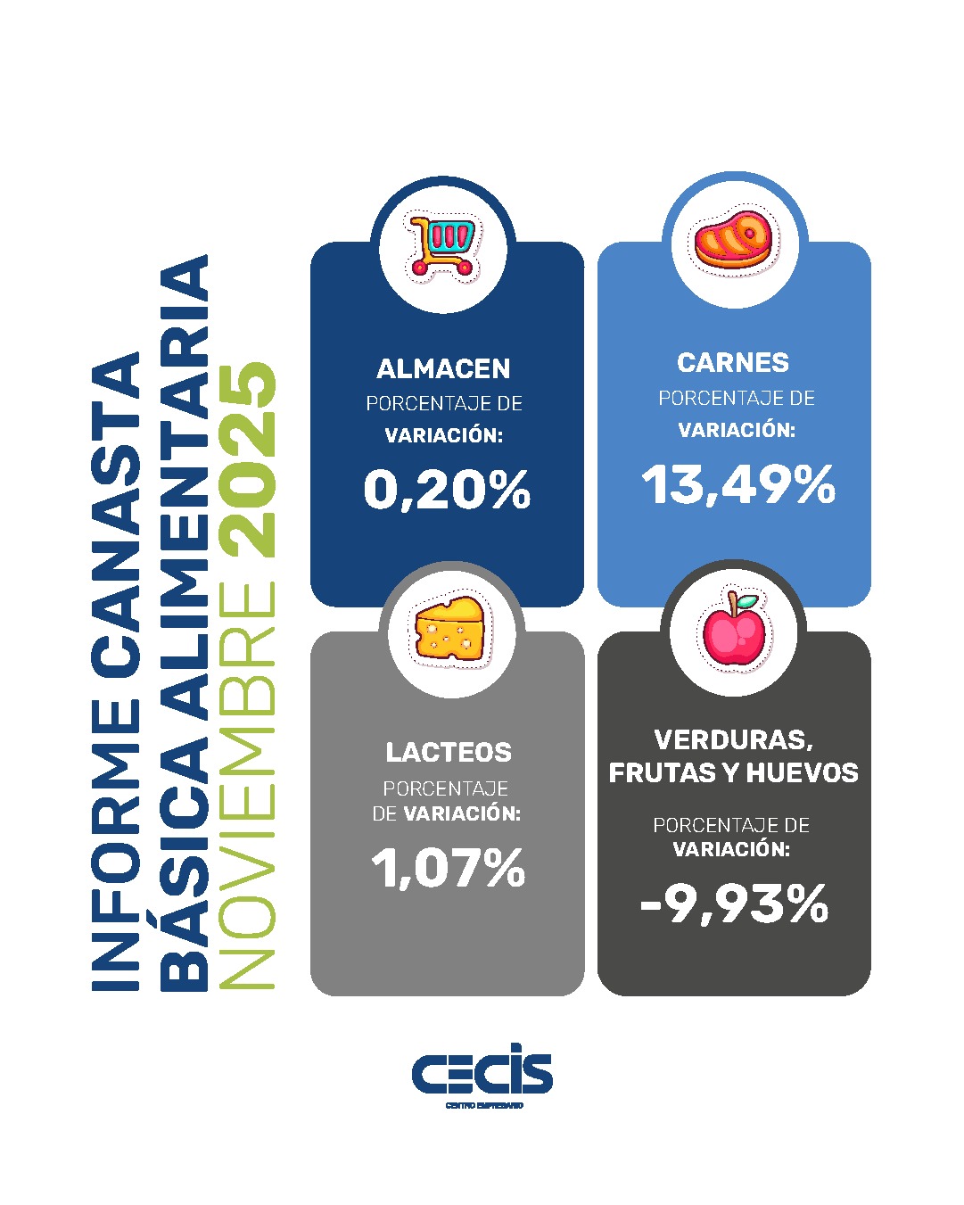 Al finalizar el mes de noviembre de 2025, el valor de la Canasta Básica Alimentaria en la ciudad de Río Cuarto se ubica en $248.301,00. Este valor representa una suba del 4,97% comparado al mes de octubre. A tener en cuenta que en el mes de octubre con relación a septiembre la suba ha sido de 4,20%, por lo que el acumulado bimensual es de 9,38%.